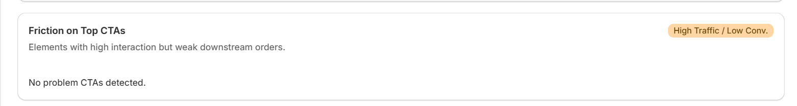 Friction on Top CTAs helps users spot elements with high interaction but weak downstream conversion, so they can identify CTAs that attract attention without turning that attention into orders.
