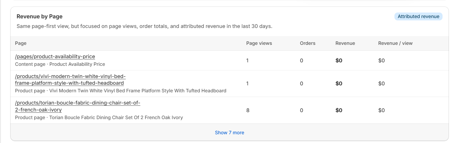 Revenue by Page gives a simpler page-first ranking of page views, orders, attributed revenue, and revenue per view.