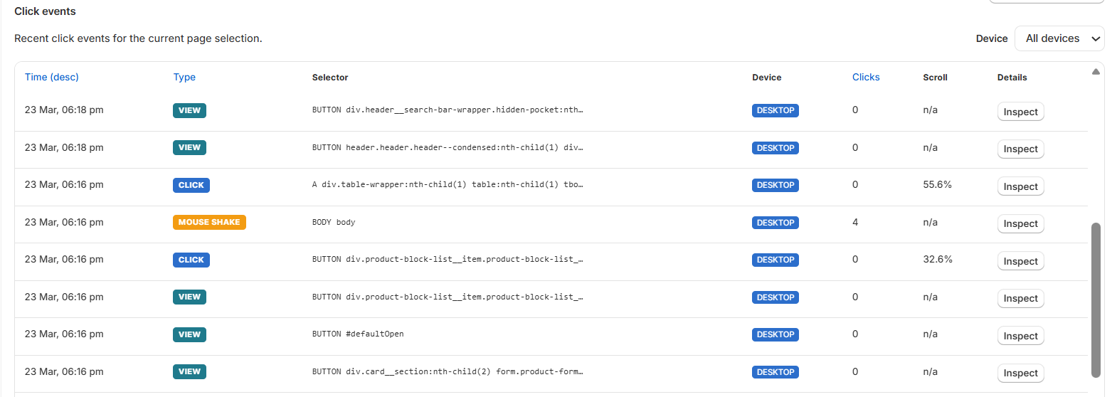 Users can review what was clicked, which device it happened on, what type of click it was, and inspect additional element-level details.