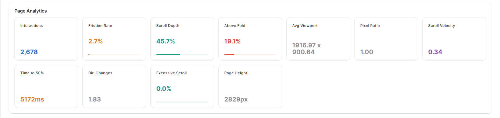 When expanded, it also shows more advanced page behavior metrics like scroll velocity, time to depth, and excessive scrolling.