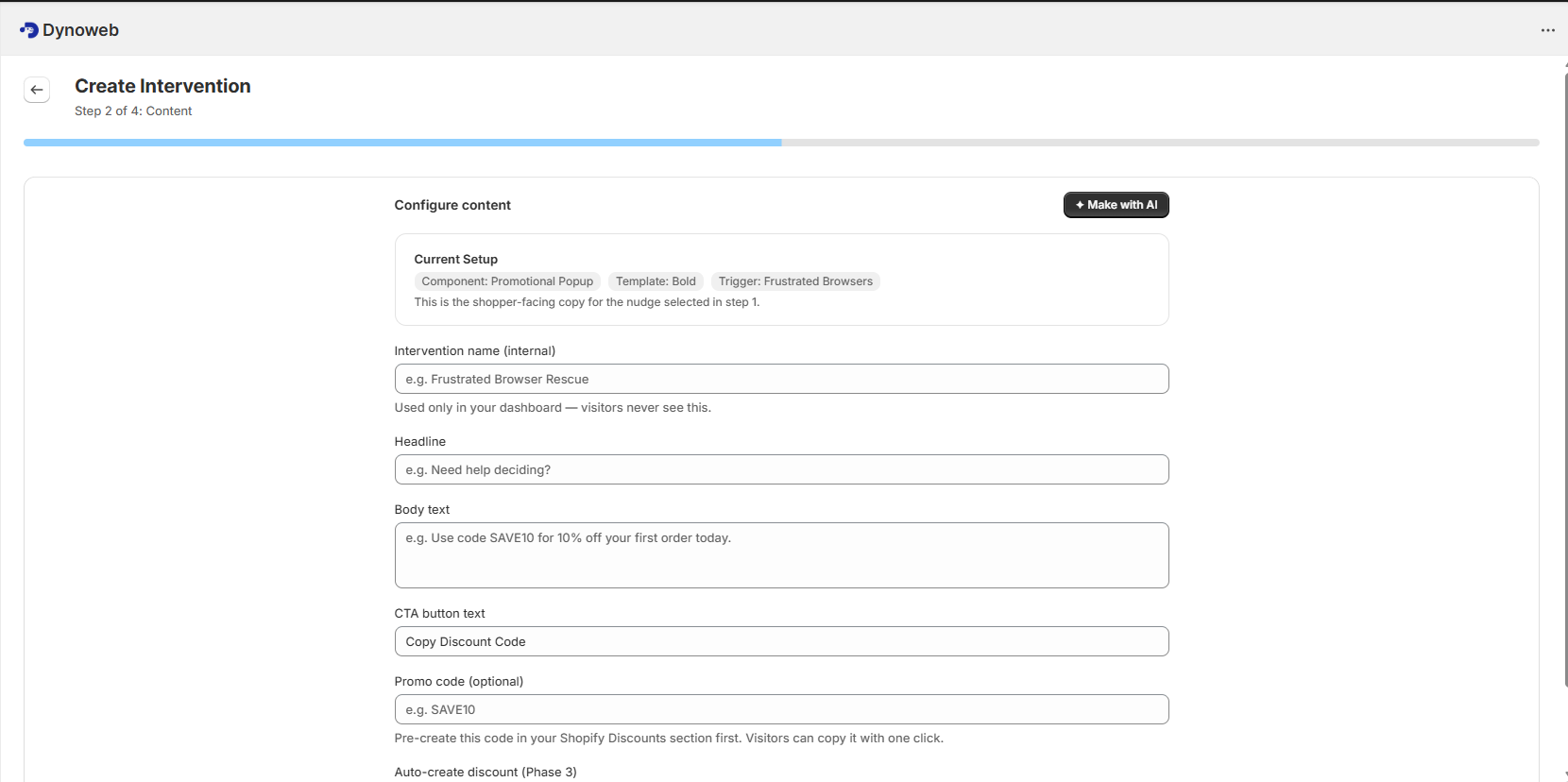 The Make with AI button at the top right of this step generates all fields automatically based on the component type, visual style, and behavioral trigger selected. It produces copy matched to the specific visitor moment — a frustrated browser gets a different message than a cart abandoner.