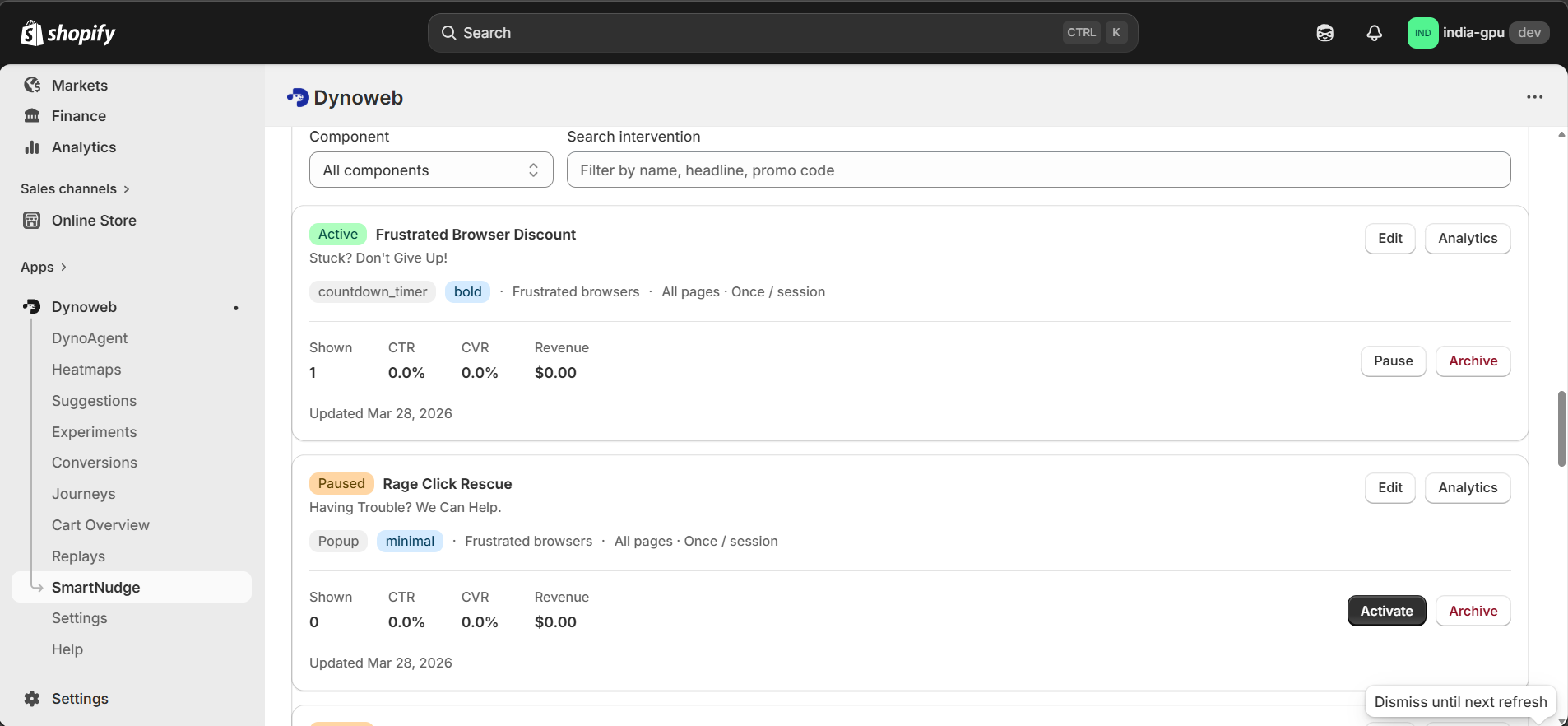 SmartNudge is where DynoWeb moves from observing visitor behavior to acting on it in real time. It lets users create behavior-triggered messages that appear on the storefront when a visitor matches a specific pattern — without touching the live theme and without writing code.